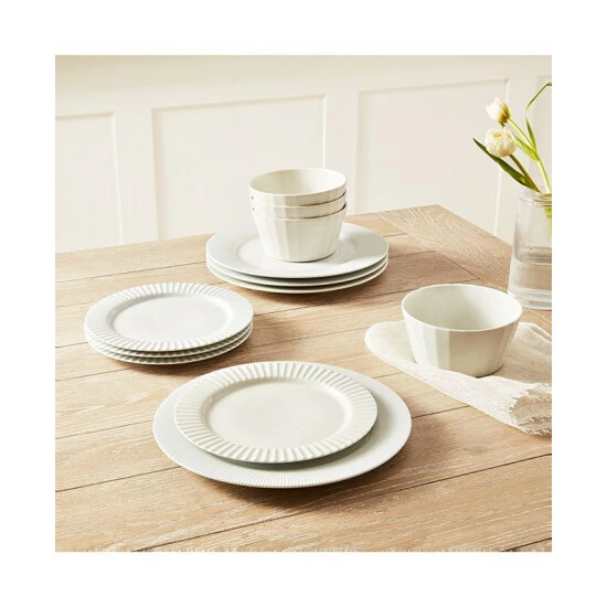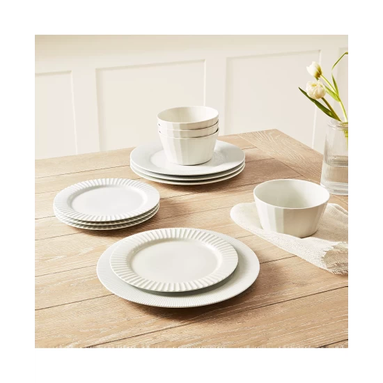 Clean and contemporary fluted shapes define Hotel Collection’s dinnerware service for four in versatile and easy-care white porcelain.